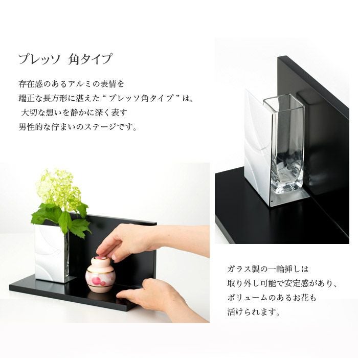 存在感のあるアルミの表情を端正な長方形に湛えた“プレッソ角タイプ”は、大切な想いを静かに深く表す男性的な佇まいのステージです。