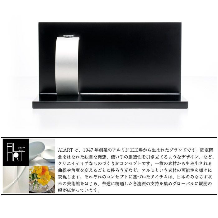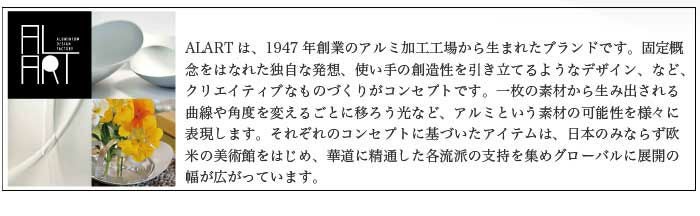 ALARTは、1947年創業のアルミ加工工場から生まれたブランドです。固定概念をはなれた独自な発想、使い手の創造性を引き立てるようなデザイン、など、クリエイティブなものづくりがコンセプトです。一枚の素材から生み出される曲線や角度を変えるごとに移ろう光など、アルミという素材の可能性を様々に表現します。それぞれのコンセプトに基づいたアイテムは、日本のみならず欧米の美術館をはじめ、華道に精通した各流派の支持を集めグローバルに展開の幅が広がっています。
