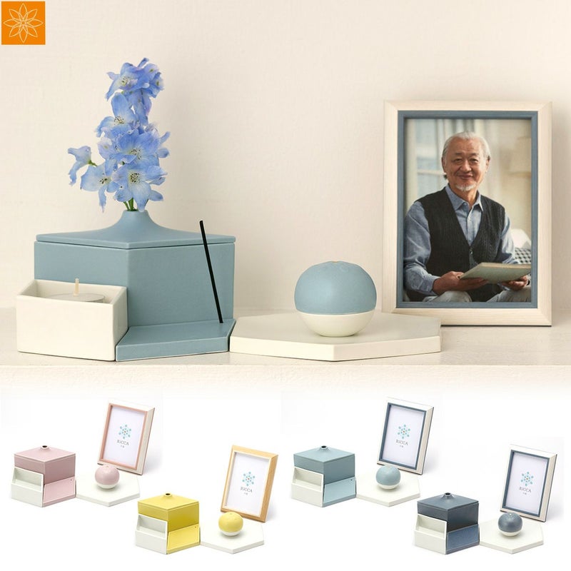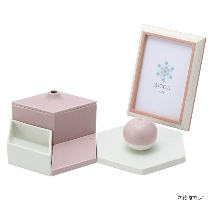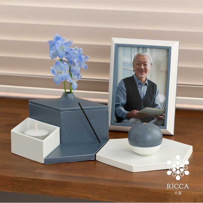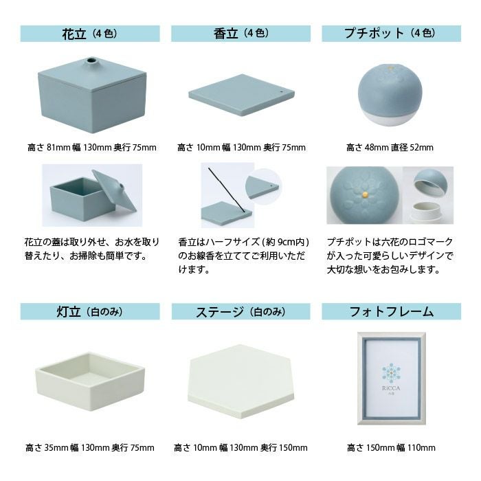 六花は、花立・灯立・香立・ステージ・プチポット・フォトフレームがそれぞれ独立している6点セットのソウル ステージ。