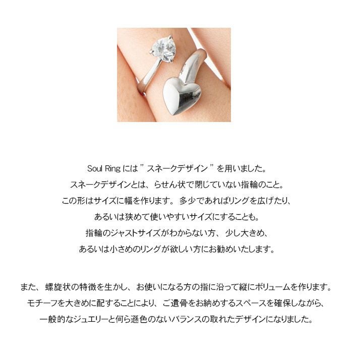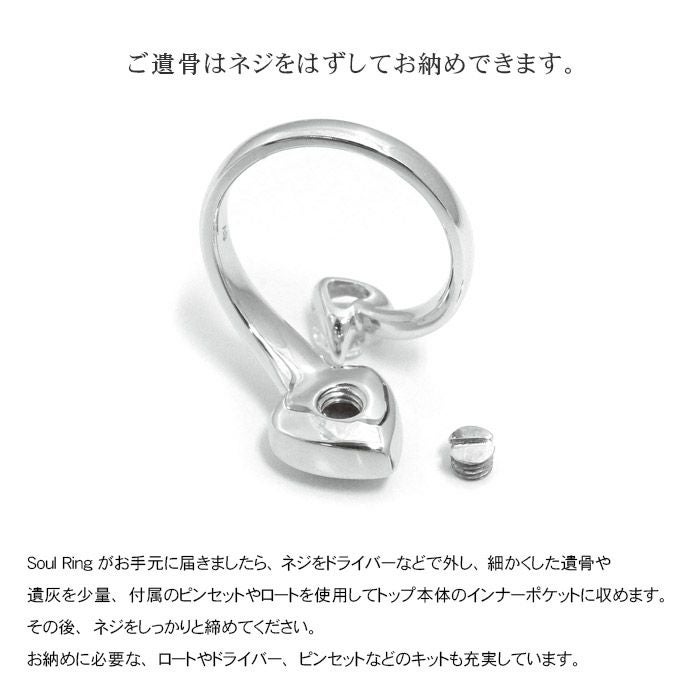 Soul Ringはモチーフにネジ止めできるデザインを採用し、ご注文からお待たせせず、大切な方のご遺骨をご自身の手でお納めし、身に着けられるジュエリーのコンセプトをそのままに指輪でも実現しました。