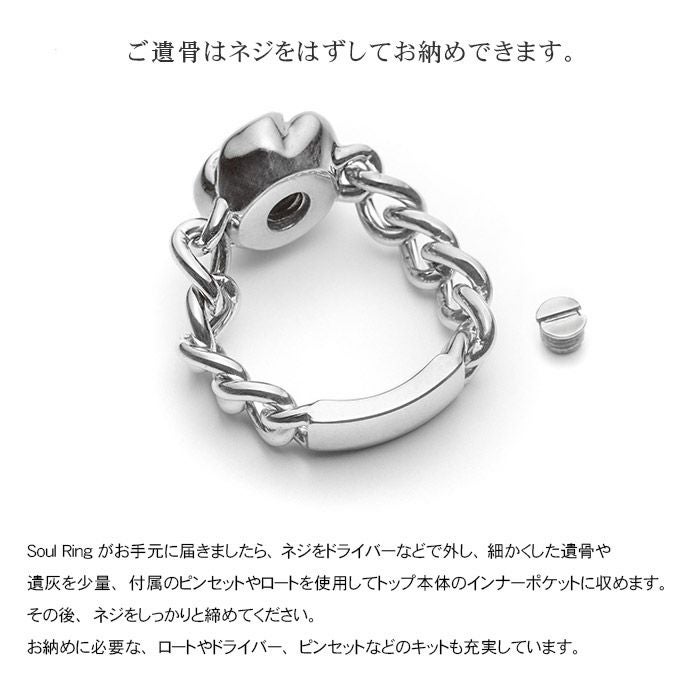 Soul Ringはモチーフにネジ止めできるデザインを採用し、ご注文からお待たせせず、大切な方のご遺骨をご自身の手でお納めし、身に着けられるジュエリーのコンセプトをそのままに指輪でも実現しました。