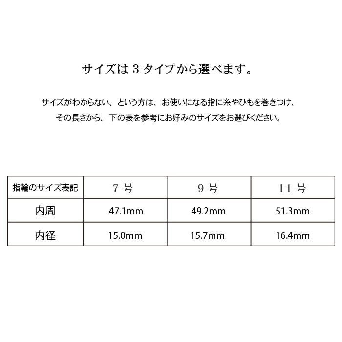 サイズがわからない、という方は、お使いになる指に糸を巻きつけ、その長さから、表を参考にお好みのサイズをお選びください。