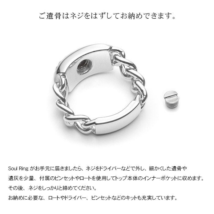 Soul Ringはモチーフにネジ止めできるデザインを採用し、ご注文からお待たせせず、大切な方のご遺骨をご自身の手でお納めし、身に着けられるジュエリーのコンセプトをそのままに指輪でも実現しました。