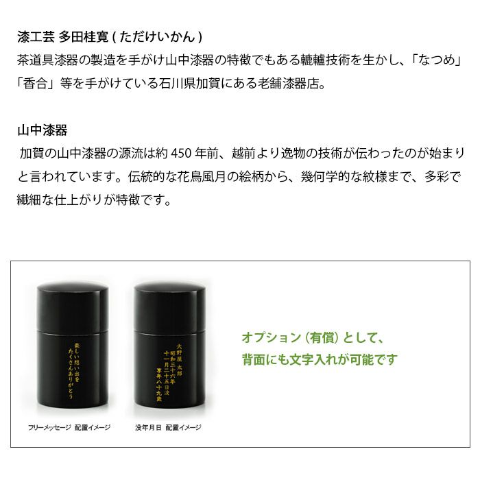 明治10年創業の山中漆器の老舗 多田桂寛(ただけいかん)の伝統工芸師たちの手により、ひとつひとつ丹念に仕上げられた本漆天然木のミニ骨壺です。