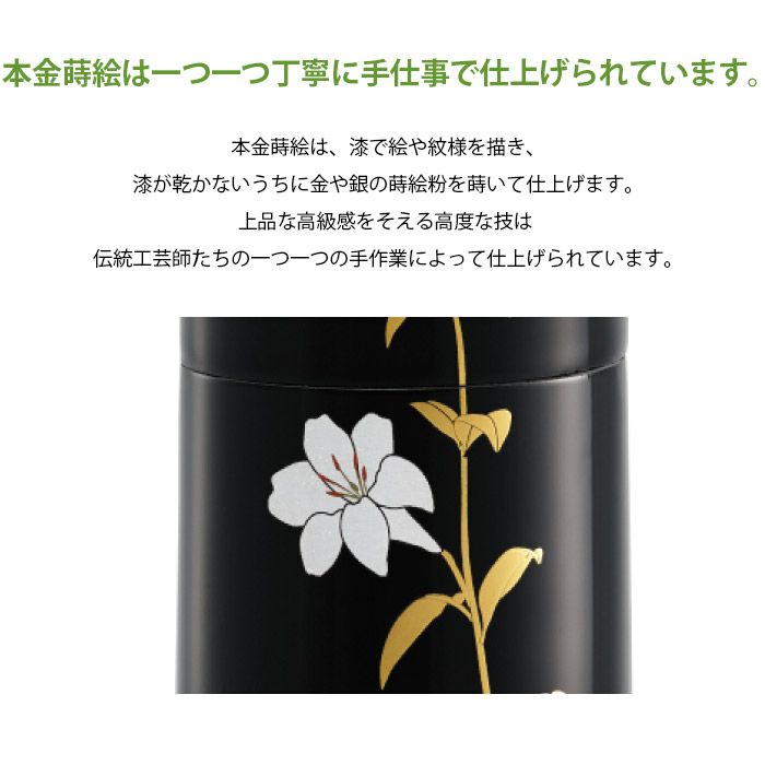 本金蒔絵によって描かれた季節のうつり変わりや美しい花々が大切な人をやさしくつつみこみます。