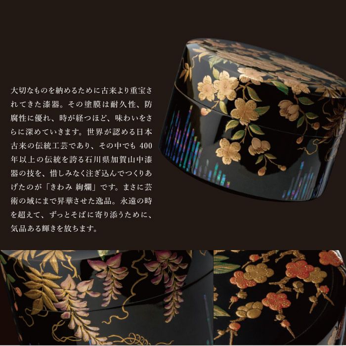大切なものを納めるために古来より重宝されてきた漆器。その塗膜は耐久性、防腐性に優れ、時が経つほど、味わいをさらに深めていきます。世界が認める日本古来の伝統工芸であり、その中でも400年以上の伝統を誇る石川県加賀山中漆器の技を、惜しみなく注ぎ込んでつくりあげたのが「きわみ 絢爛」です。まさに芸術の域にまで昇華させた逸品。永遠の時を超えて、ずっとそばに寄り添うために、気品ある輝きを放ちます。