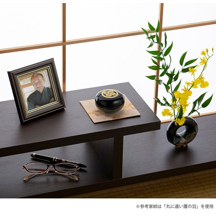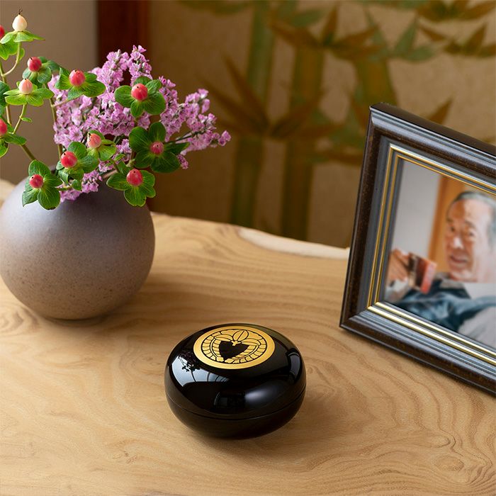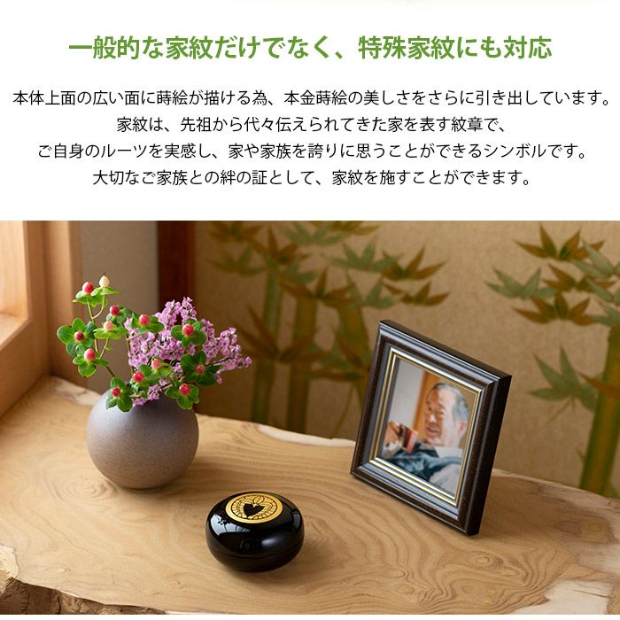 まるで手と手を合わせた時のような暖かさを感じさせるやわらかな姿と、描かれたその家独自の家紋が、大切な人を家族みんなでやさしくつつみこみます。