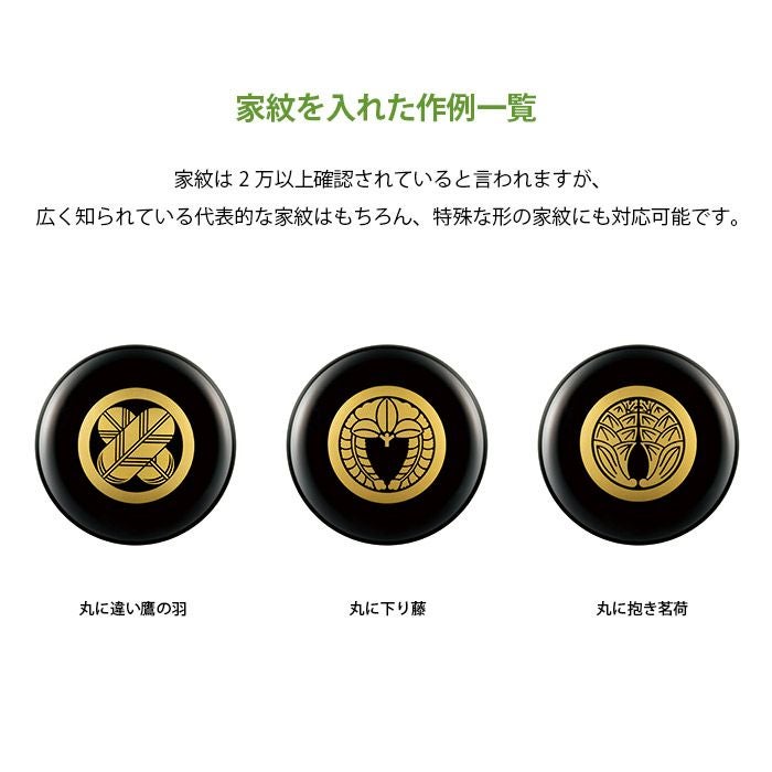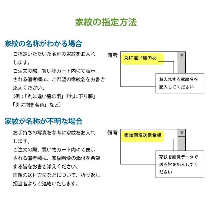 ご注文の時、表示される備考欄に、ご希望の家紋名をお書き添えください。(例:『丸に違い鷹の羽』『丸に下り藤』『丸に抱き茗荷』など)