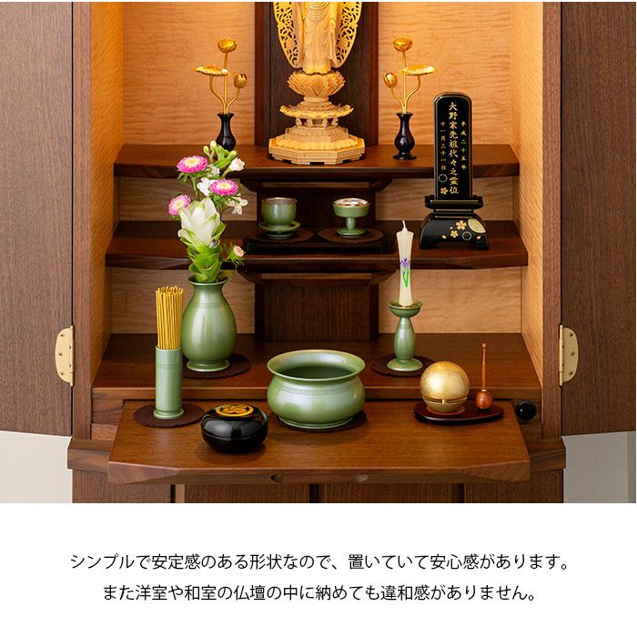シンプルで安定感のある形状なので、置いていて安心感があります。また洋室や和室の仏壇の中に納めても違和感がありません。