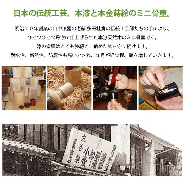 ひとつひとつ描きあげられた「本金蒔絵」のミニ骨壷。