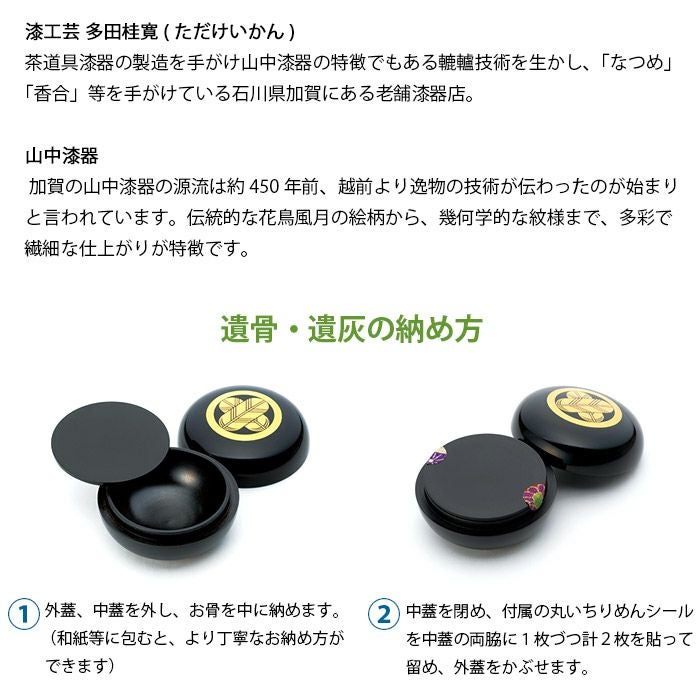 銘入り個装箱、ミニ骨壺本体(ウコン風呂敷付き)、巾着(ちりめん素材)、山中漆器説明書、お骨の納め方(ちりめんシール付き)