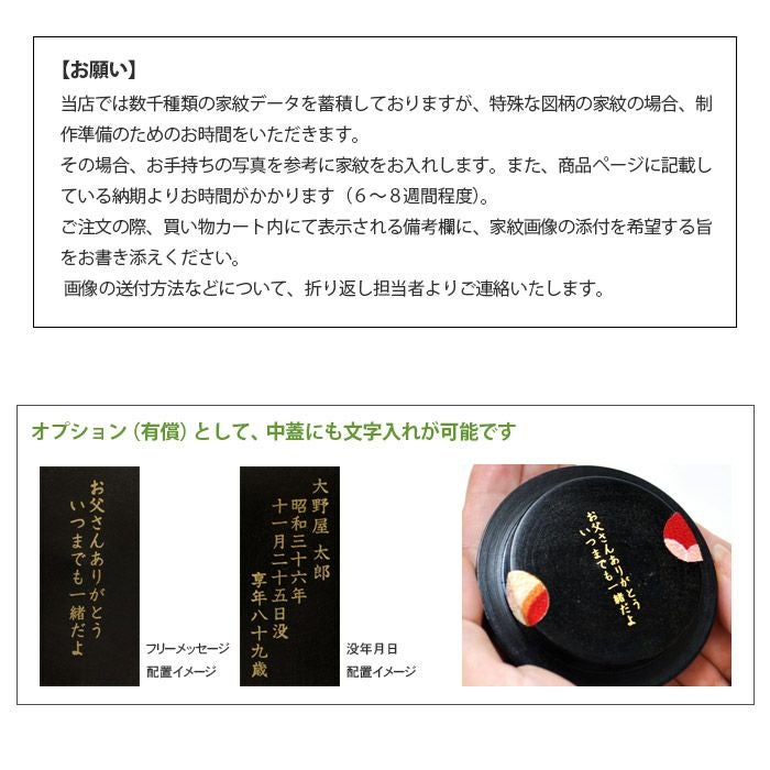 その場合、お手持ちの写真を参考に家紋をお入れします。また、商品ページに記載している納期よりお時間がかかります(6~8週間程度)。