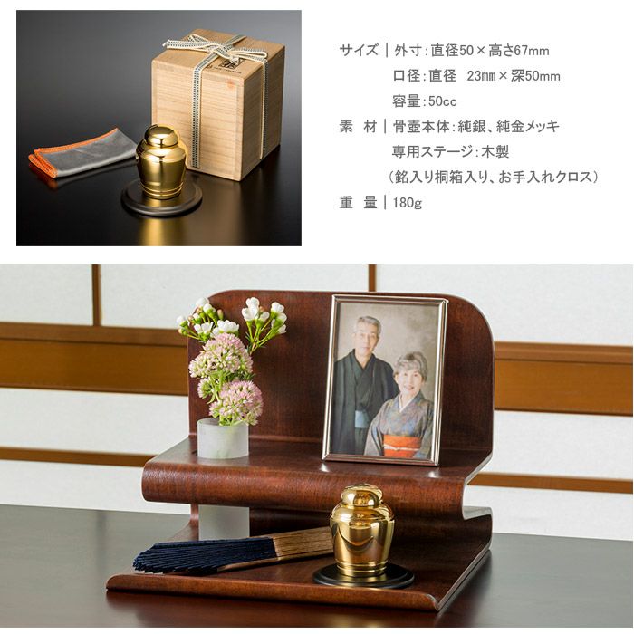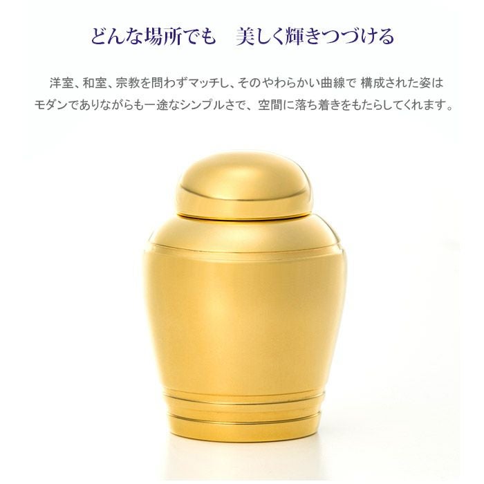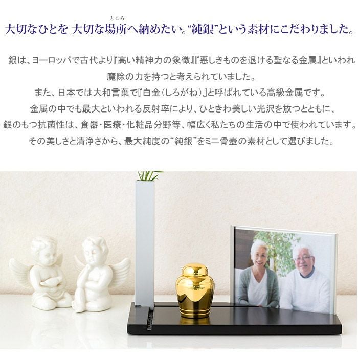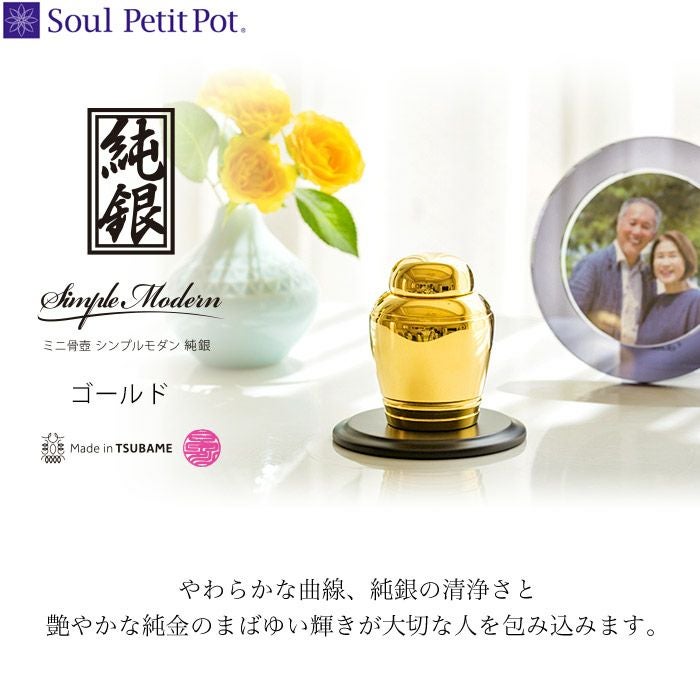 シンプルモダン 純銀 ゴールドは、純銀のミニ骨壷に0.3μ(ミクロン)の24金メッキを施し、金の優れた光沢と耐食性に優れています。また、このメッキを施すことによって、純金製品と同等の光沢とカラーを実現しました。