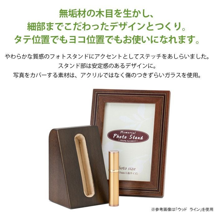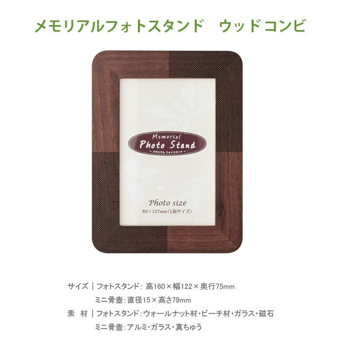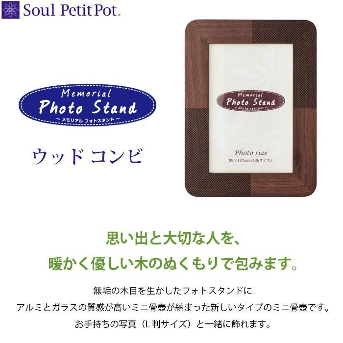 無垢の木目を生かしたフォトスタンドにアルミとガラスの質感が高いミニ骨壺が納まった新しいタイプのミニ骨壺です。