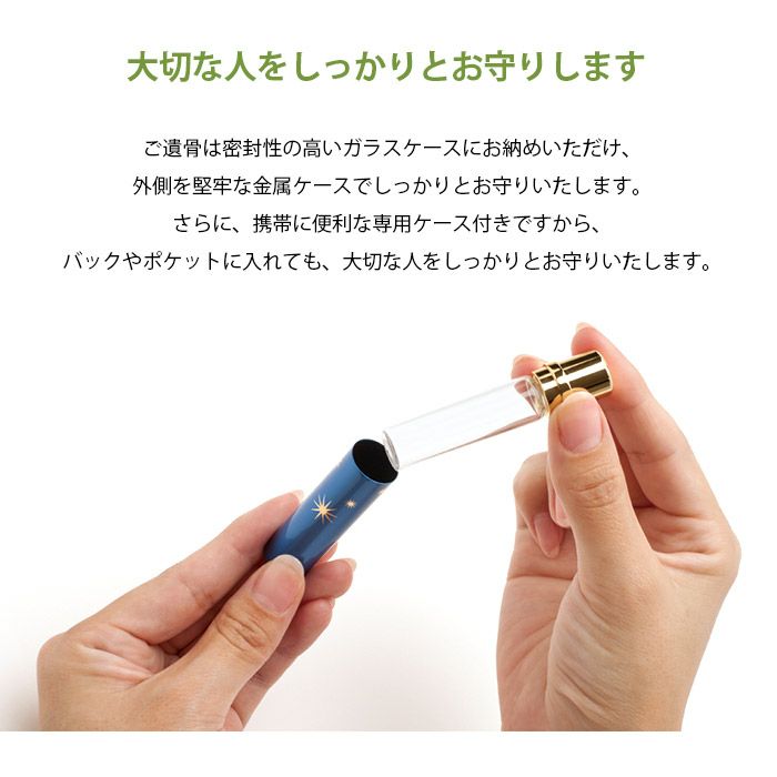 ご遺骨は密封性の高いガラスケースにお納めいただけ、外側を堅牢な金属ケースでしっかりとお守りいたします。