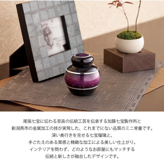 尾張七宝に伝わる至高の伝統工芸を伝承する加藤七宝製作所と新潟燕市の金属加工の技が実現した、これまでにない品質のミニ骨壷です。