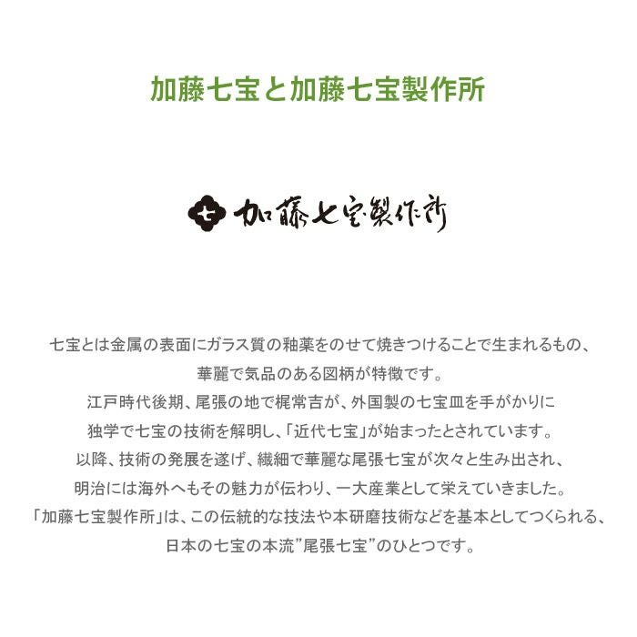 七宝とは金属の表面にガラス質の釉薬をのせて焼きつけることで生まれるもの、華麗で気品のある図柄が特徴です。江戸時代後期、尾張の地で梶常吉が、外国製の七宝皿を手がかりに独学で七宝の技術を解明し、「近代七宝」が始まったとされています。以降、技術の発展を遂げ、繊細で華麗な尾張七宝が次々と生み出され、明治には海外へもその魅力が伝わり、一大産業として栄えていきました。「加藤七宝製作所」は、この伝統的な技法や本研磨技術などを基本としてつくられる、日本の七宝の本流”尾張七宝”のひとつです。