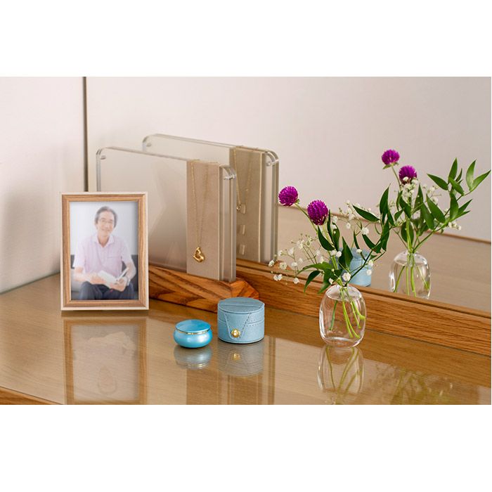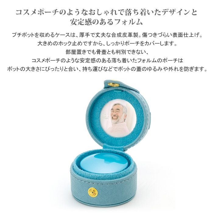 部屋置きでも骨壺とも判別できない、コスメポーチのような安定感のある落ち着いたフォルムのポーチはポットの大きさにぴったりと合い、持ち運びなどでポットの蓋のゆるみや外れを防ぎます。