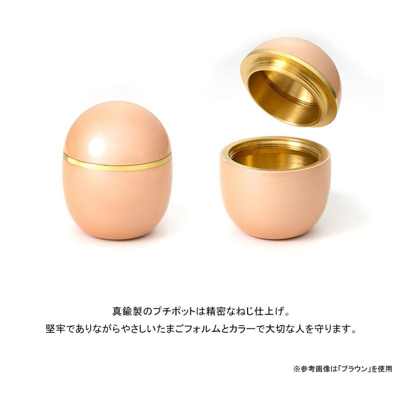 真鍮製のプチポットは精密なねじ仕上げ。堅牢でありながらやさしいたまごフォルムとカラーで大切な人を守ります。