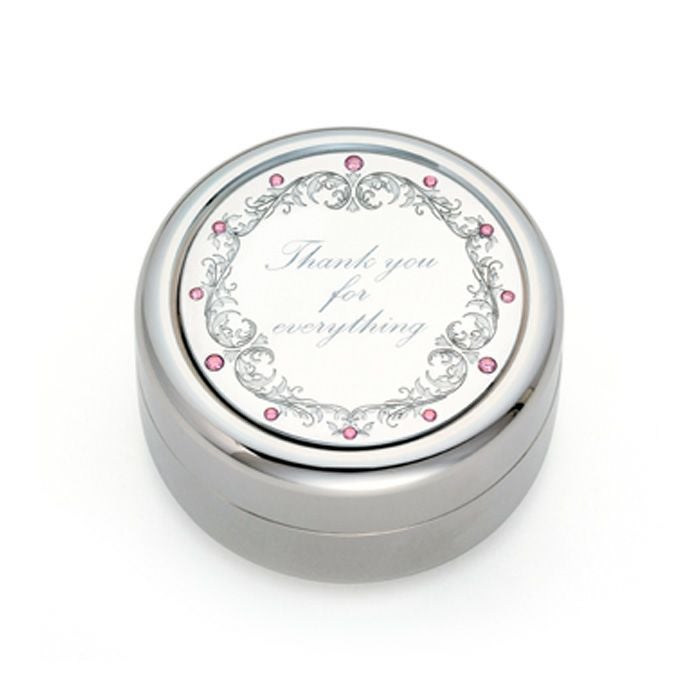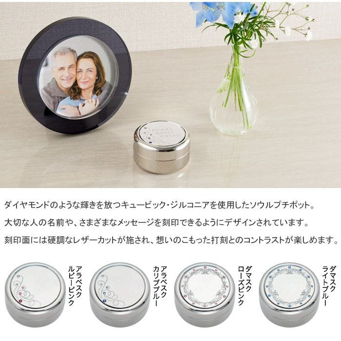 ダイヤモンドのような輝きを放つキュービック・ジルコニアを使用した、ソウルプチポットです。大切な人の名前や、さまざまなメッセージを刻印できるようにデザインされています。刻印面には硬調なレザーカットが施され、想いのこもった打刻とのコントラストが楽しめます。