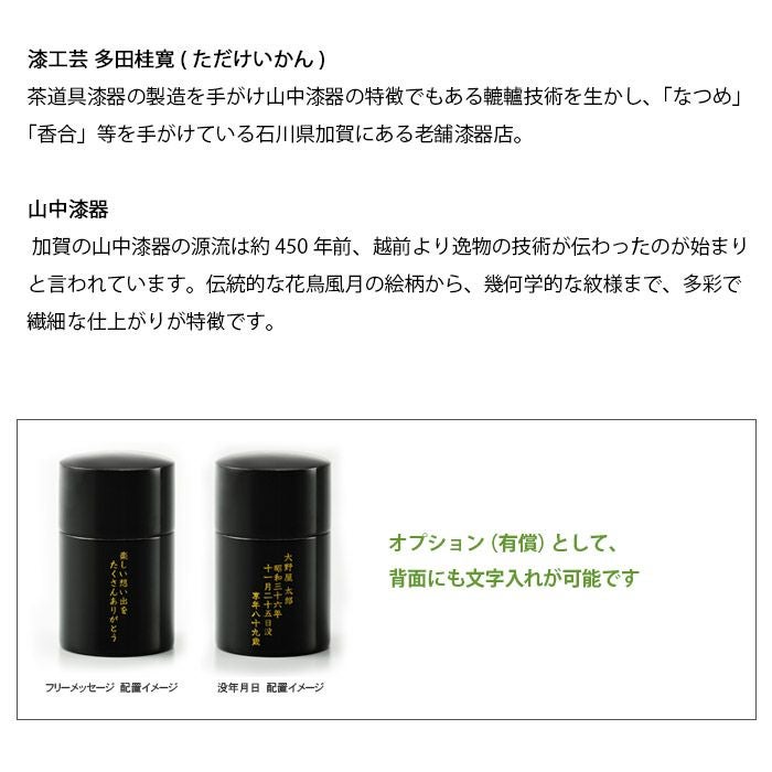 明治10年創業の山中漆器の老舗 多田桂寛(ただけいかん)の伝統工芸師たちの手により、ひとつひとつ丹念に仕上げられた本漆天然木のミニ骨壺です。