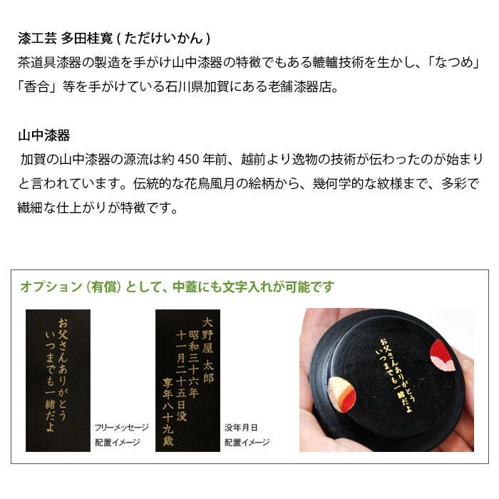 明治10年創業の山中漆器の老舗 多田桂寛(ただけいかん) の伝統工芸師たちの手のよってひとつひとつ丹念に仕上げられた一品です。