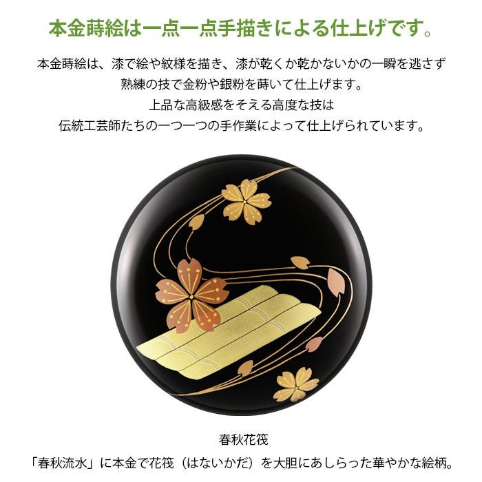 本金蒔絵は、漆で絵や紋様を描き、漆が乾くか乾かないかの一瞬を逃さず熟練の技で金粉や銀粉を蒔いて仕上げます。上品な高級感をそえる高度な技は伝統工芸師たちの一つ一つの手作業によって仕上げられています。