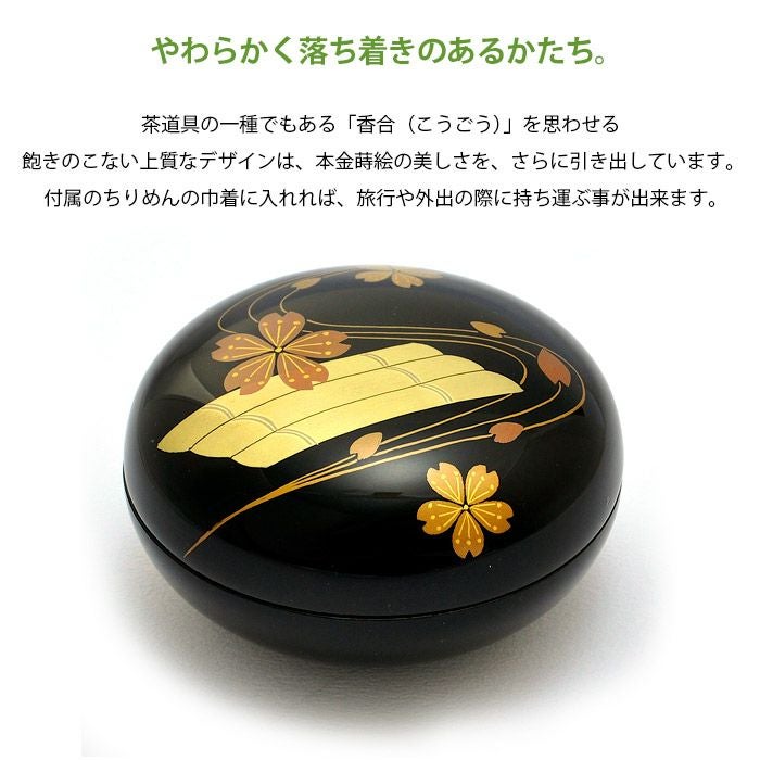 茶道具の一種でもある「香合(こうごう)」を思わせる飽きのこない上質なデザインは、本金蒔絵の美しさを、さらに引き出しています。 付属のちりめんの巾着に入れれば、旅行や外出の際に持ち運ぶ事が出来ます。