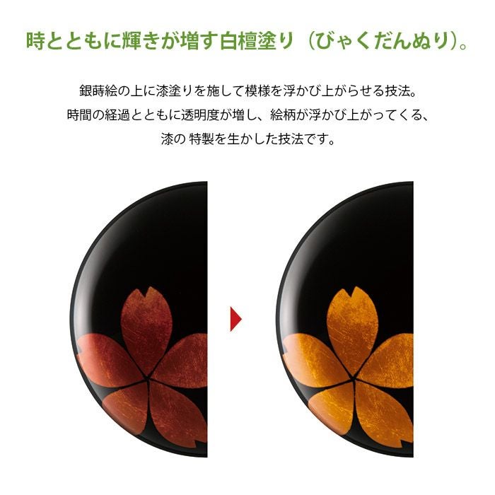 銀蒔絵の上に漆塗りを施して模様を浮かび上がらせる技法。時間の経過とともに透明度が増し、絵柄が浮かび上がってくる、漆の 特製を生かした技法です。