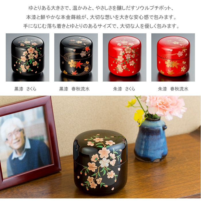ゆとりある大きさで、温かみと、やさしさを醸しだすソウルプチポット、本漆と鮮やかな本金蒔絵が、大切な想いを大きな安心感で包みます。