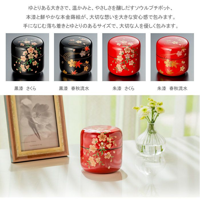 ゆとりある大きさで、温かみと、やさしさを醸しだすソウルプチポット、本漆と鮮やかな本金蒔絵が、大切な想いを大きな安心感で包みます。