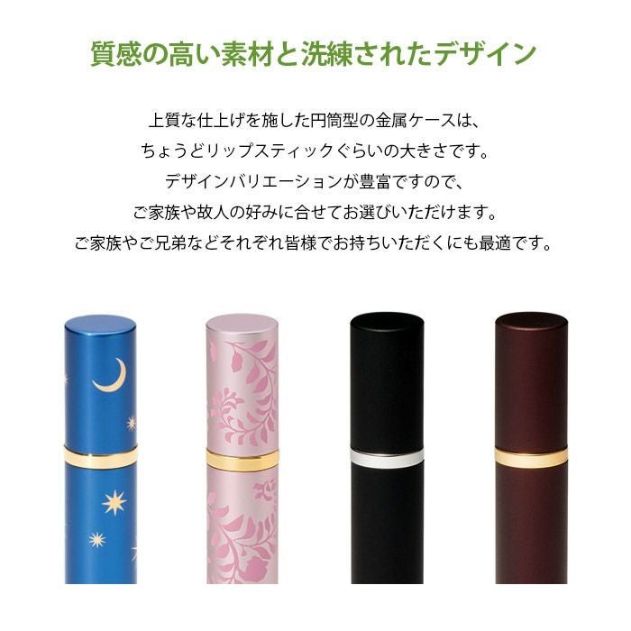 大切な人をどこへでもつれて行ってあげられるまるでリップスティックのようにコンパクトで洗練されたデザインの携帯型ミニ骨壺。専用ケースに入って登場です。