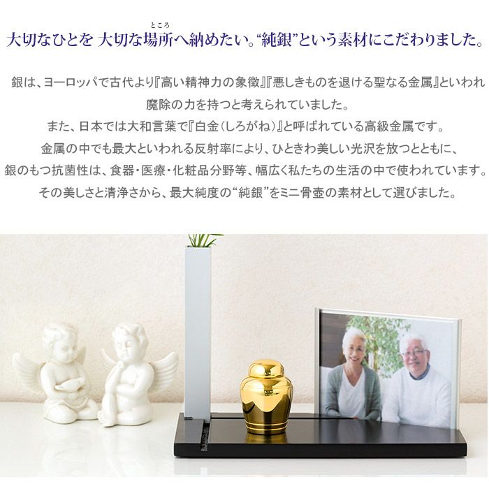 シンプルモダン 純銀 ゴールドは、純銀のミニ骨壷に0.3μ(ミクロン)の24金メッキを施し、金の優れた光沢と耐食性に優れています。また、このメッキを施すことによって、純金製品と同等の光沢とカラーを実現しました。