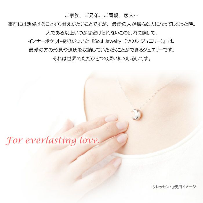 ご家族、ご兄弟、ご両親、恋人。事前には想像することすら耐えがたいことですが、最愛の人が帰らぬ人になってしまった時。人である以上いつかは避けられないこの別れに際して、インナーポケット機能がついた『Soul Jewelry(ソウルジュエリー)』は、最愛の方の形見や遺灰を収納していただくことができるジュエリーペンダントです。