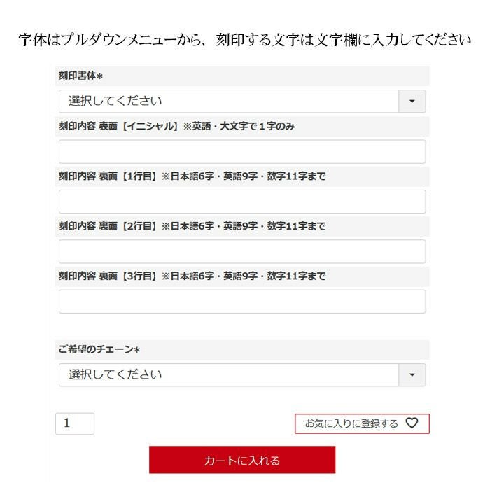 ・「カート入れる」ボタンの上にある入力フォームに刻印内容をご入力の上、ご注文ください。