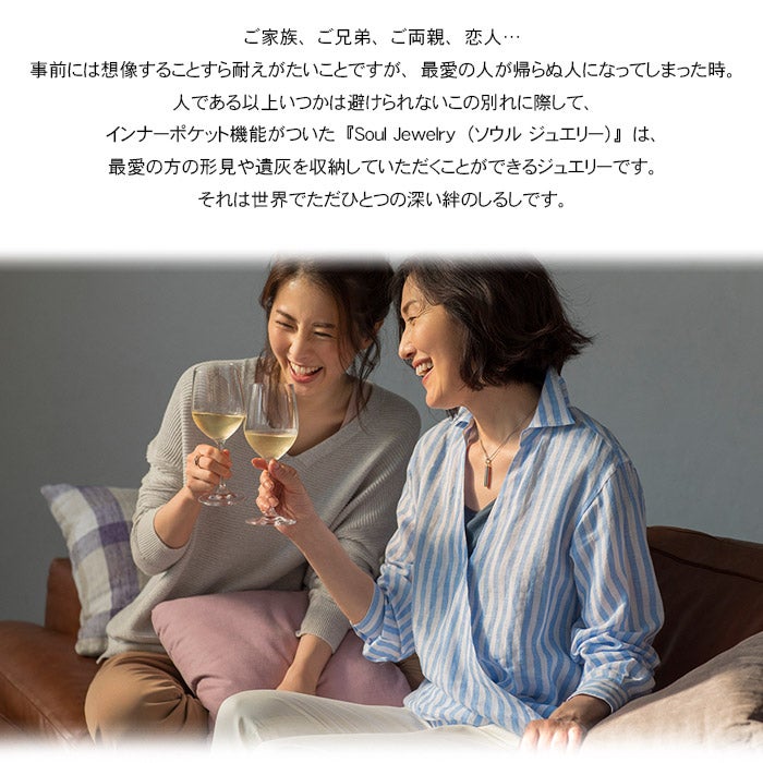 ご家族、ご兄弟、ご両親、恋人。事前には想像することすら耐えがたいことですが、最愛の人が帰らぬ人になってしまった時。人である以上いつかは避けられないこの別れに際して、インナーポケット機能がついた『Soul Jewelry(ソウルジュエリー)』は、最愛の方の形見や遺灰を収納していただくことができるジュエリーペンダントです。