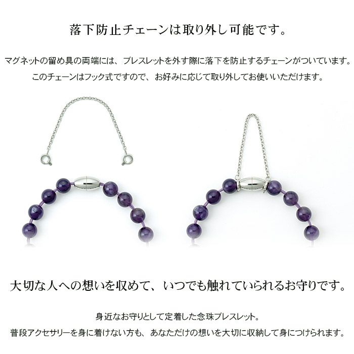 マグネットの留め具の両端には、ブレスレットを外す際に落下を防止するチェーンがついています。