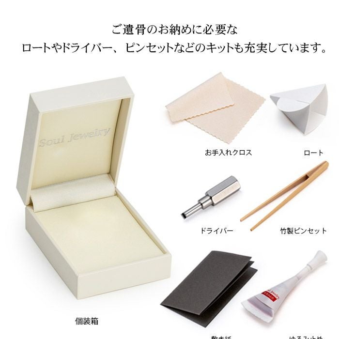 個装箱、納骨キット、専用ドライバー、竹製ピンセット、敷き紙、紙製ロート、お手入れクロス、取扱説明書、ねじゆるみ止め固着剤