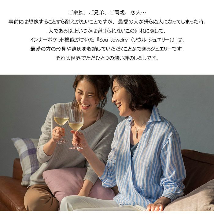 人である以上いつかは避けられないこの別れに際して、インナーポケット機能がついた”Soul Jewelry”は、最愛の方の形見や遺灰を収納していただくことができるジュエリーペンダントです。