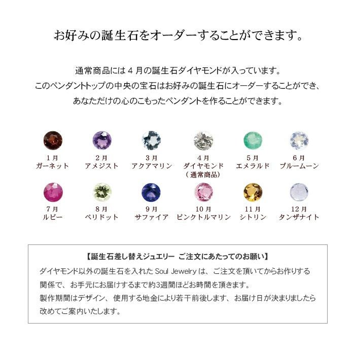 1月 ガーネット、2月 アメジスト、3月 アクアマリン、4月 ダイヤモンド(0.014ct)、 5月 エメラルド、 6月 ブルームーン、 7月 ルビー、 8月 ペリドット、 9月 サファイヤ、 10月 ピンクトルマリン、 11月 シトリン、 12月 タンザナイト