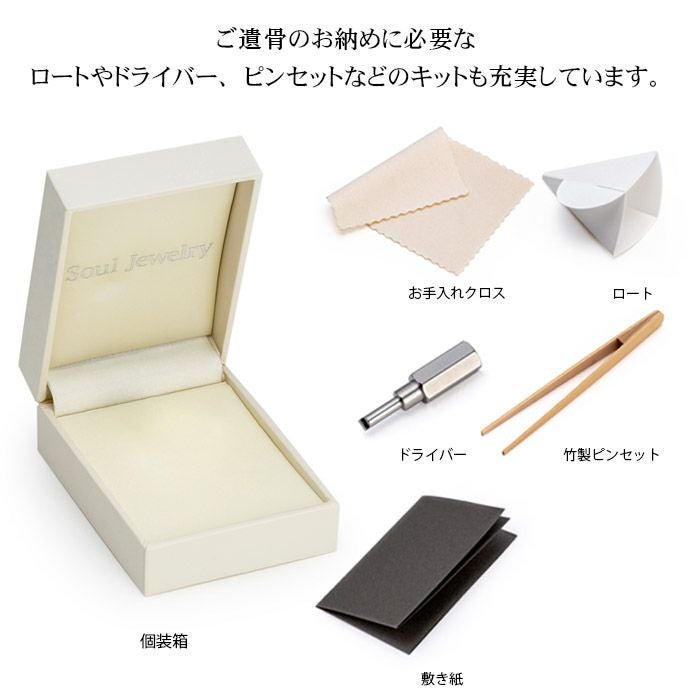 ダイヤモンド鑑定書(中央宝石研究所発行)、個装箱、納骨キット、専用ドライバー、竹製ピンセット、敷き紙、紙製ロート、お手入れクロス、取扱説明書