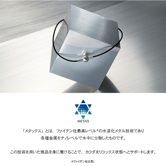 「メタックス」とは、ファイテン社最高レベル*の水溶化メタル技術であり各種金属をナノレベルで水中に分散したものです。この技術を用いた商品を身に着けることで、カラダをリラックス状態へとサポートします。