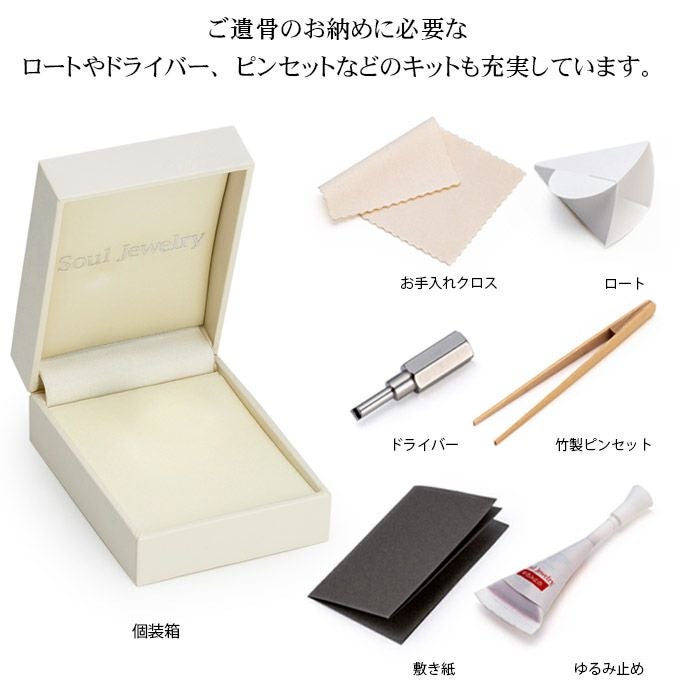 個装箱、納骨キット、専用ドライバー、竹製ピンセット、敷き紙、紙製ロート、お手入れクロス、取扱説明書、ゆるみ止め