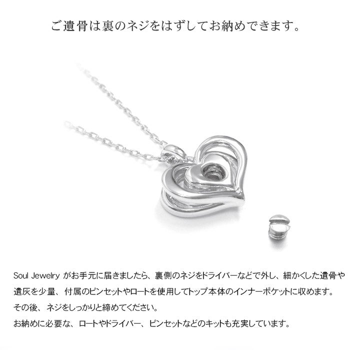 ご家族、ご兄弟、ご両親、恋人。事前には想像することすら耐えがたいことですが、最愛の人が帰らぬ人になってしまった時。人である以上いつかは避けられないこの別れに際して、インナーポケット機能がついた『Soul Jewelry(ソウルジュエリー)』は、最愛の方の形見や遺灰を収納していただくことができるジュエリーペンダントです。