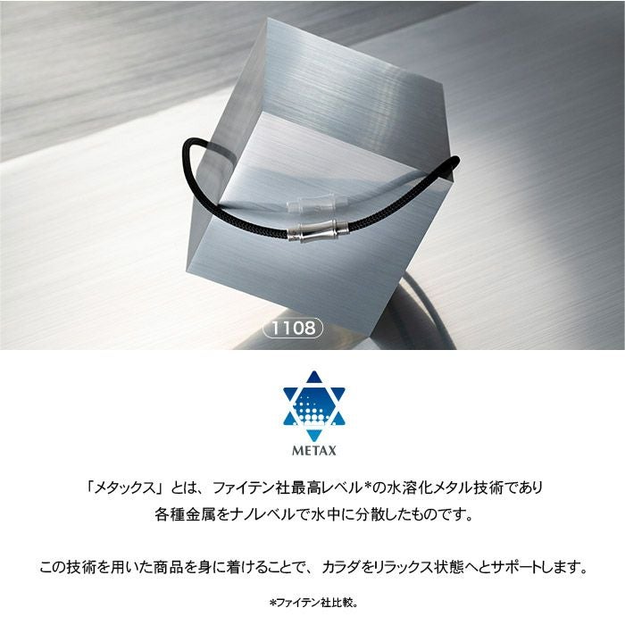 「メタックス」とは、ファイテン社最高レベル*の水溶化メタル技術であり各種金属をナノレベルで水中に分散したものです。この技術を用いた商品を身に着けることで、カラダをリラックス状態へとサポートします。