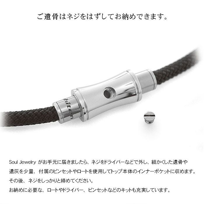 ネジを外し、細かくした遺骨や遺灰を少量、付属のロートを使用しトップ本体のインナーポケットに収めます。その後、ネジをしっかりと締めてください。