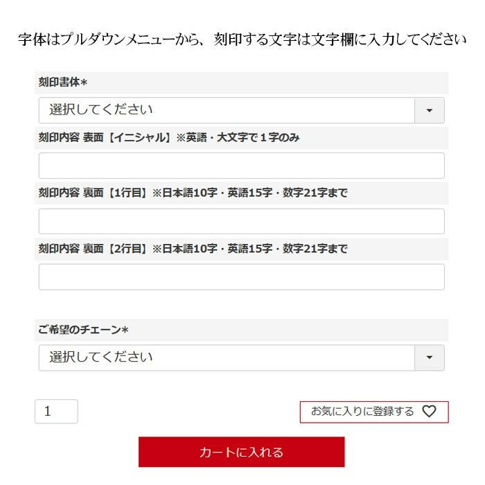 ・「カート入れる」ボタンの上にある入力フォームに刻印内容をご入力の上、ご注文ください。