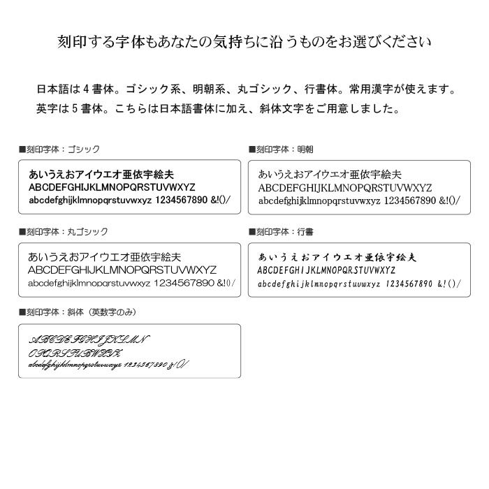 使えるフォントは5種類、当用漢字、英数字。さまざまな想いを刻み込んでいただけます。